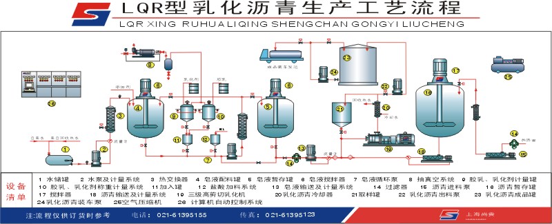 尚贵牌乳化沥青设备和改性沥青乳化设备可以手动和自动控制生产乳化沥青、改性(SBR)—乳化沥青,每小时产量2-20吨。该套设备包括水处理、水储罐、水自动计量控温系统、沥青储罐、沥青外温系统、热水泵皂液配料系统、皂液暂存罐、皂液输送泵、皂液外温系统及计量系统、过滤器、热沥青输送泵及计量系统、三级管线式乳化机、乳化沥青降温系统及回收装置,成品罐和电气自动控制系统组成。全套流程模块化设计,用户可根据需要自由组合选用,各部分配置使用如下: